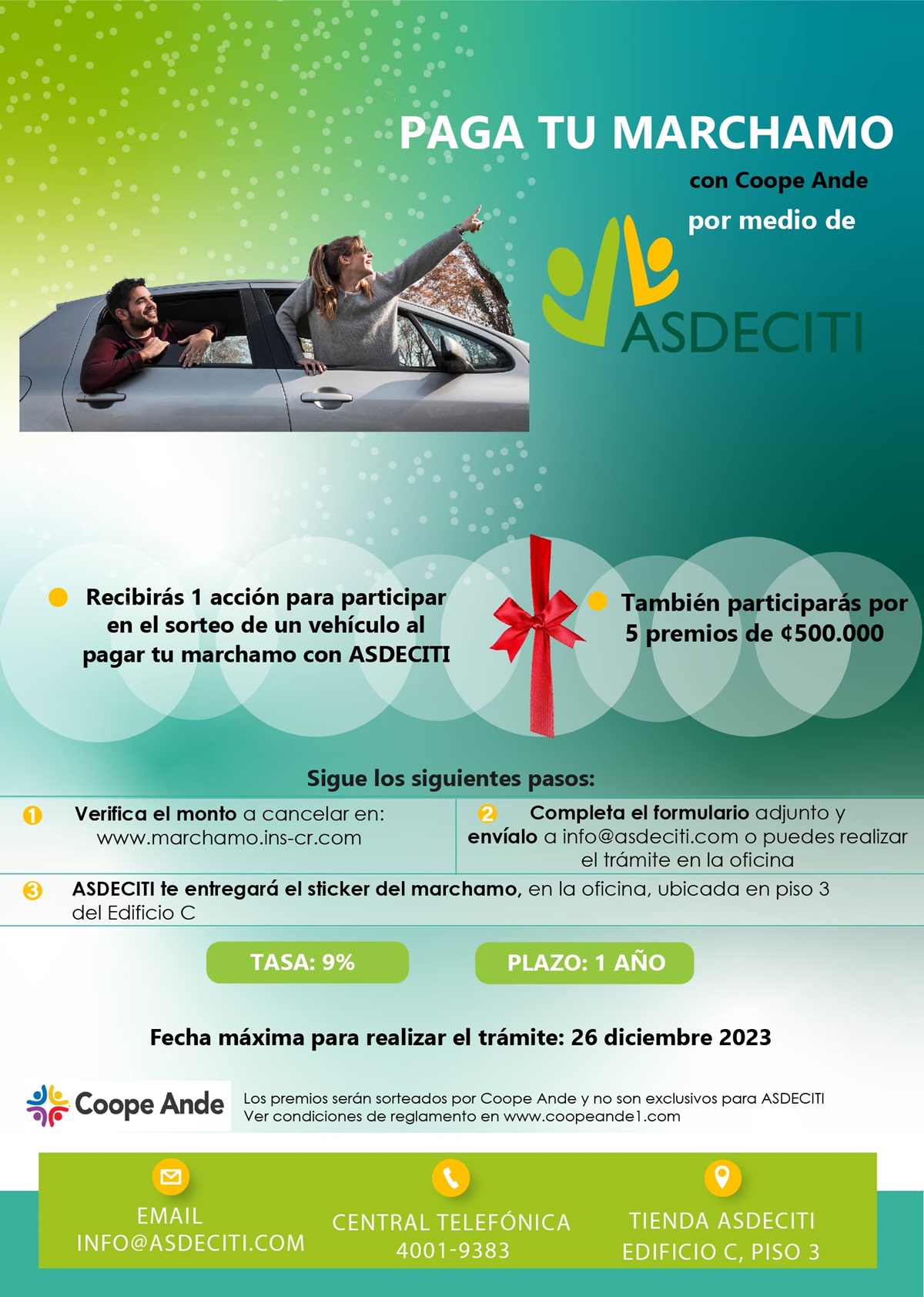 - Los premios serán sorteados por Coope Ande entre todos las personas que cancelen el marchamo a nivel nacional y no son exclusivos para ASDECITI