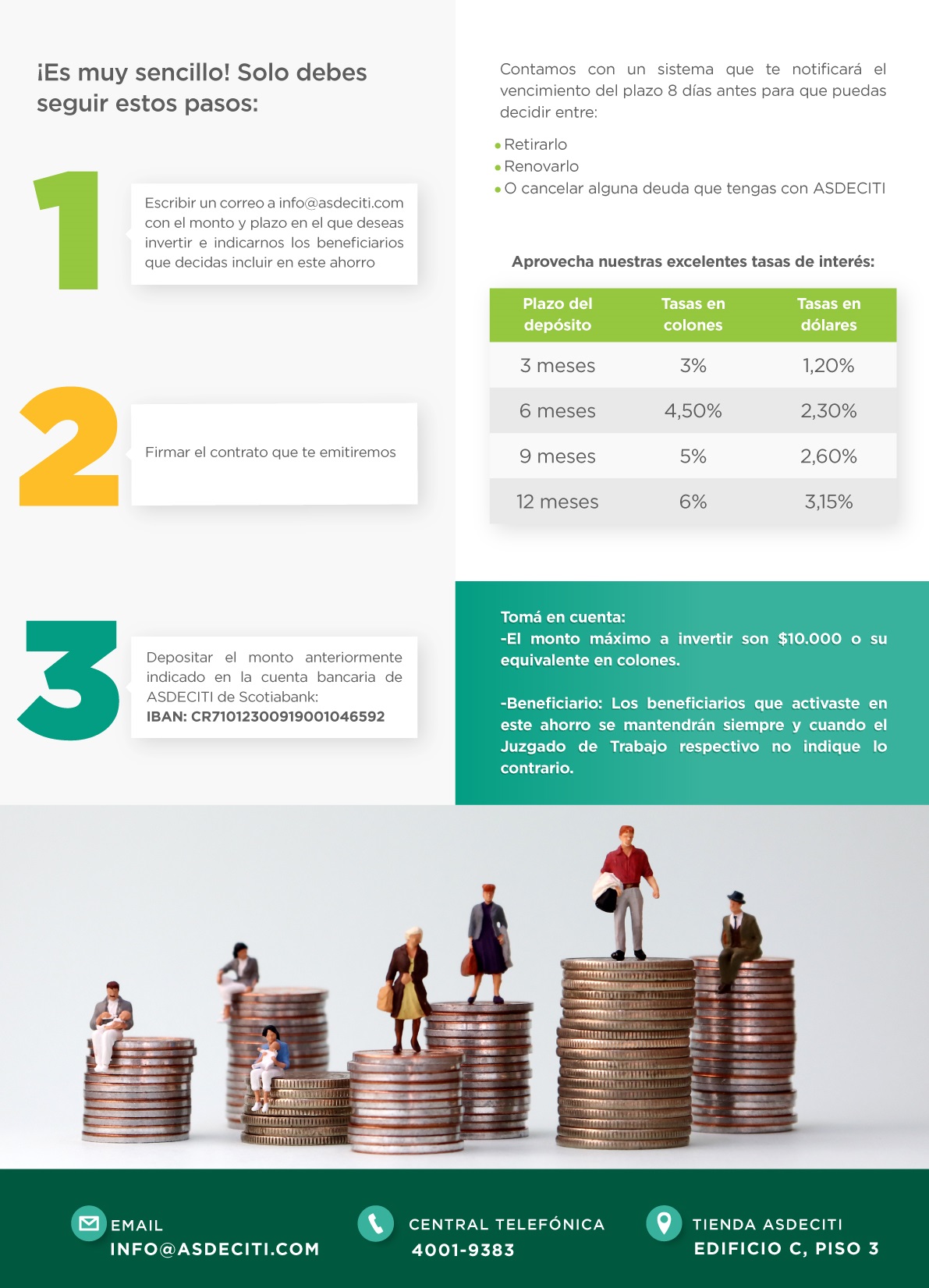 Recuerda que el monto máximo a invertir en esta modalidad son $10.000 (o su equivalente en colones) ya sea en un solo depósito o la suma de varios depósitos a plazo.