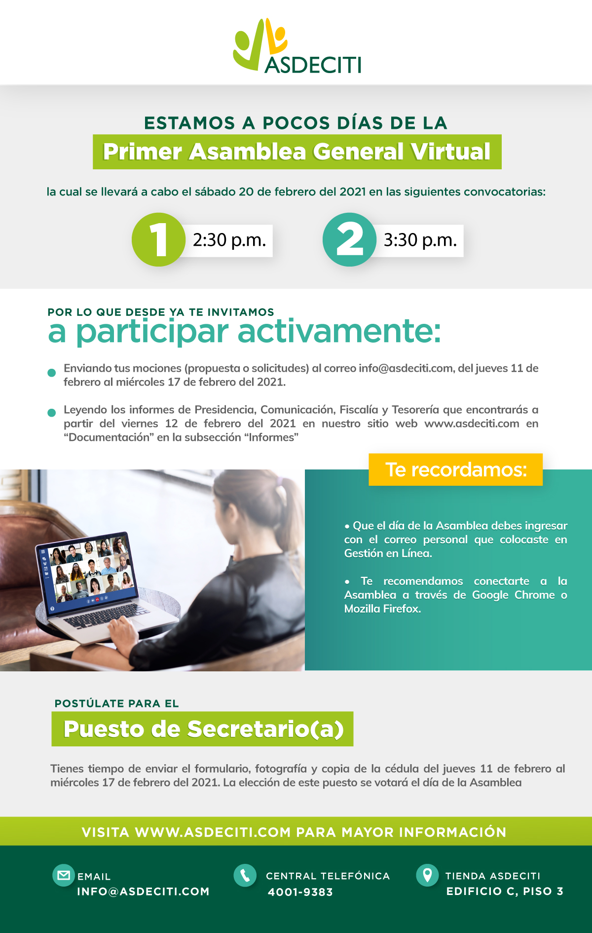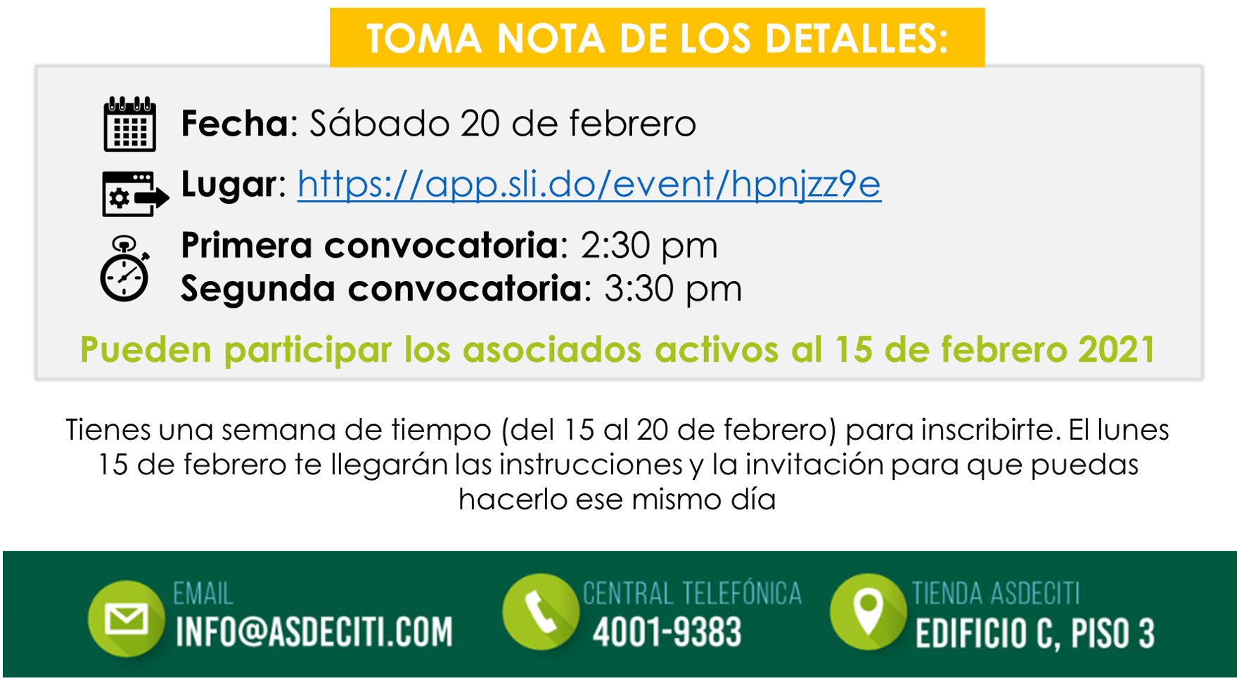 Te compartimos información de gran importancia relacionada con nuestra Asamblea General Virtual del próximo sábado 20 de febrero: