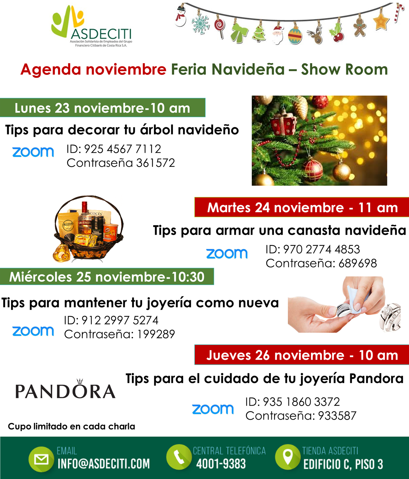 Nos complace informarte que este año hemos preparado una serie de actividades relacionadas con esta época, entre ellas nuestra tradicional feria navideña. Este año nuestros proveedores te mostrarán sus productos mediante la plataforma Zoom y te enseñarán consejos muy útiles para que puedas aprender o refrescar algunos conocimientos, por ejemplo, cómo elaborar una canasta navideña o tips de decoración.