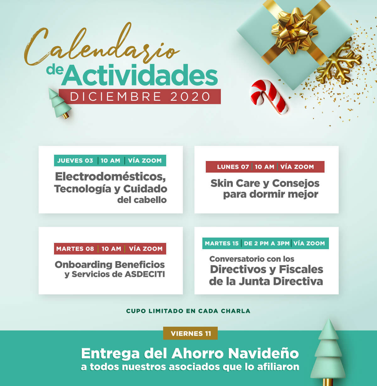 La feria iniciará el próximo 23 de noviembre y finalizará el 4 de diciembre, te invitamos a estar muy atentos para que no te pierdas ningún detalle. Adicionalmente, te recordamos que puedes realizar tus compras mediante Orden de compra, te facilitamos el link de nuestra sección de convenios para que vayas eligiendo tus obsequios https://dev.asdeciti.com/convenios/