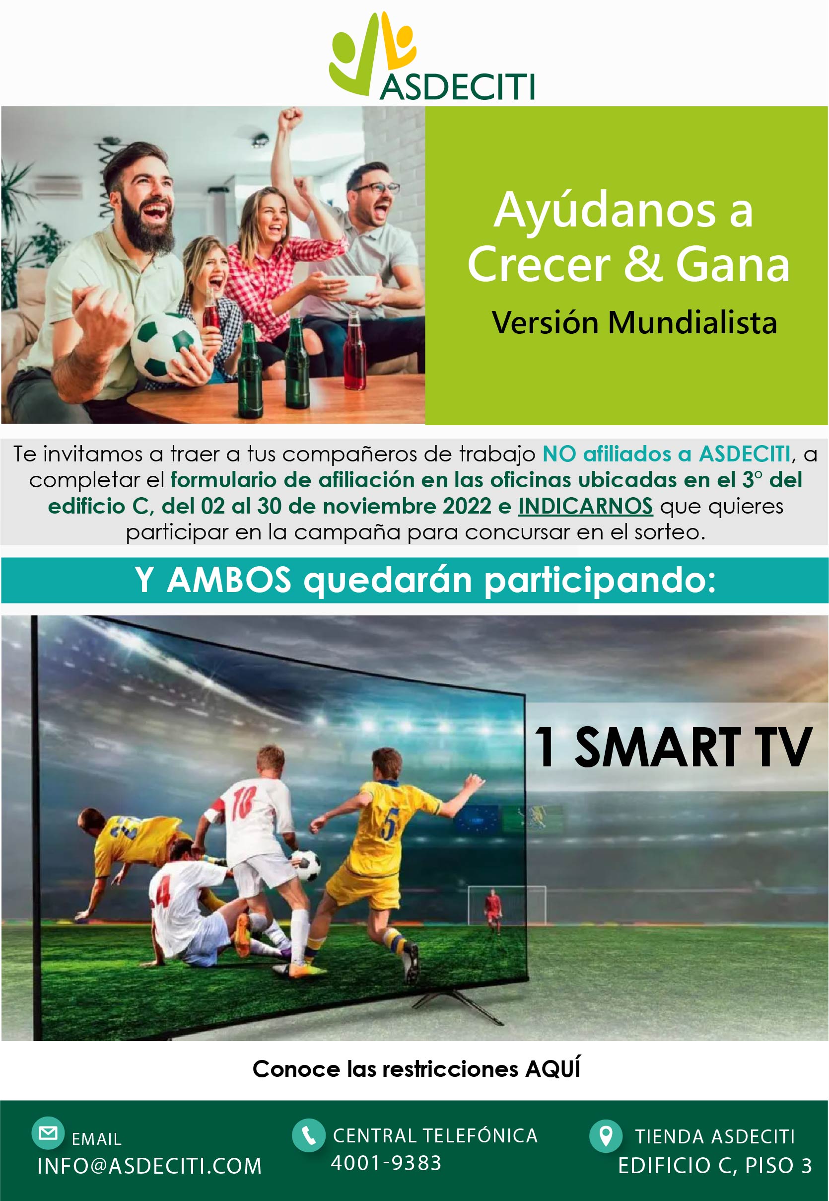 - El asociado debe traer a su compañero de trabajo a la oficina de ASDECITI ubicada en el 3° piso del Edificio C para que este complete el formulario de afiliación e indicar que quieren participar en la campaña Afilia y Gana