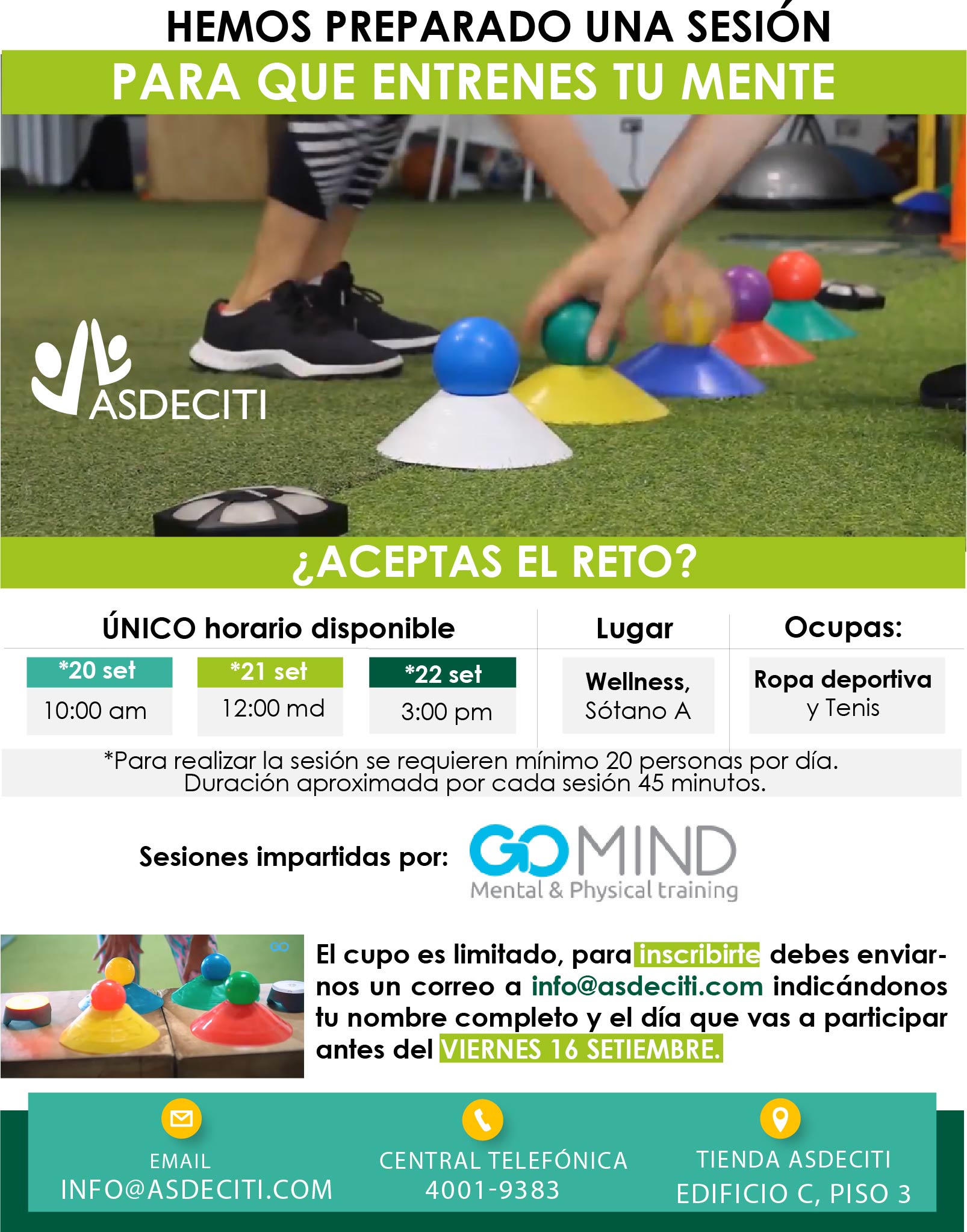 - Escribe al correo info@asdeciti.com indicando día, hora, paquete y sede
